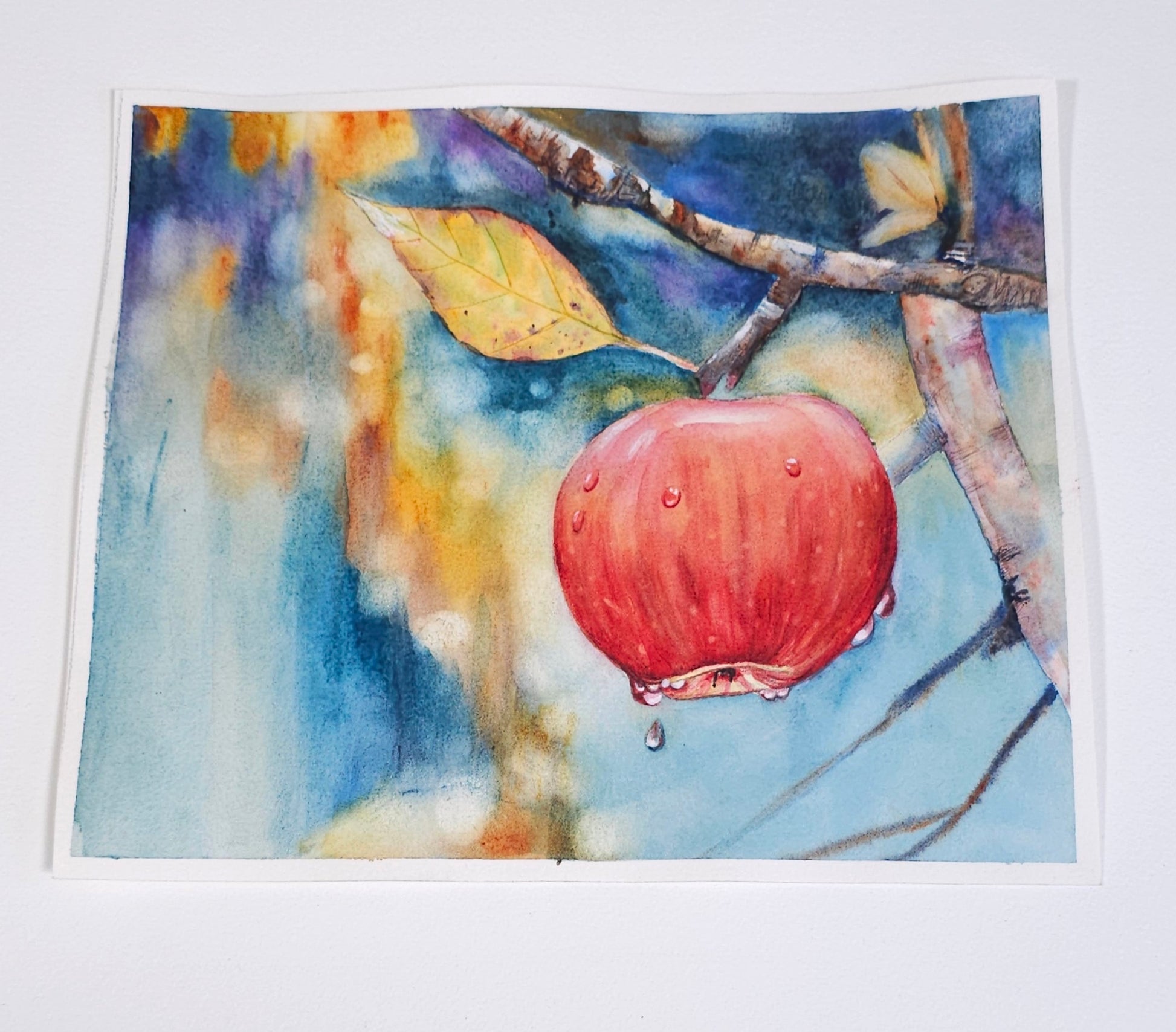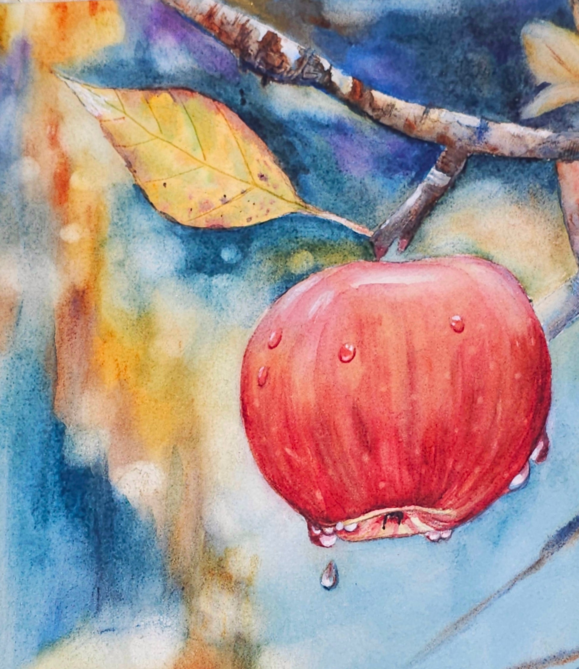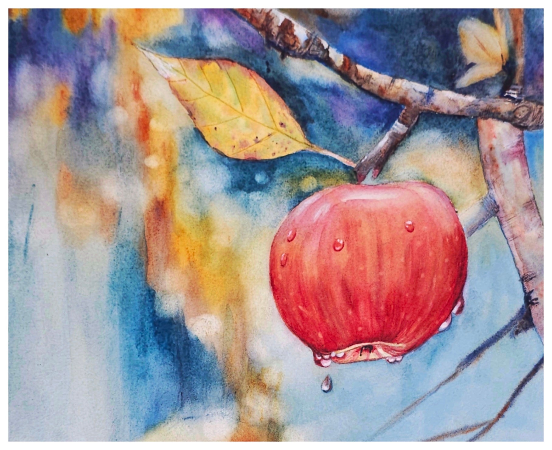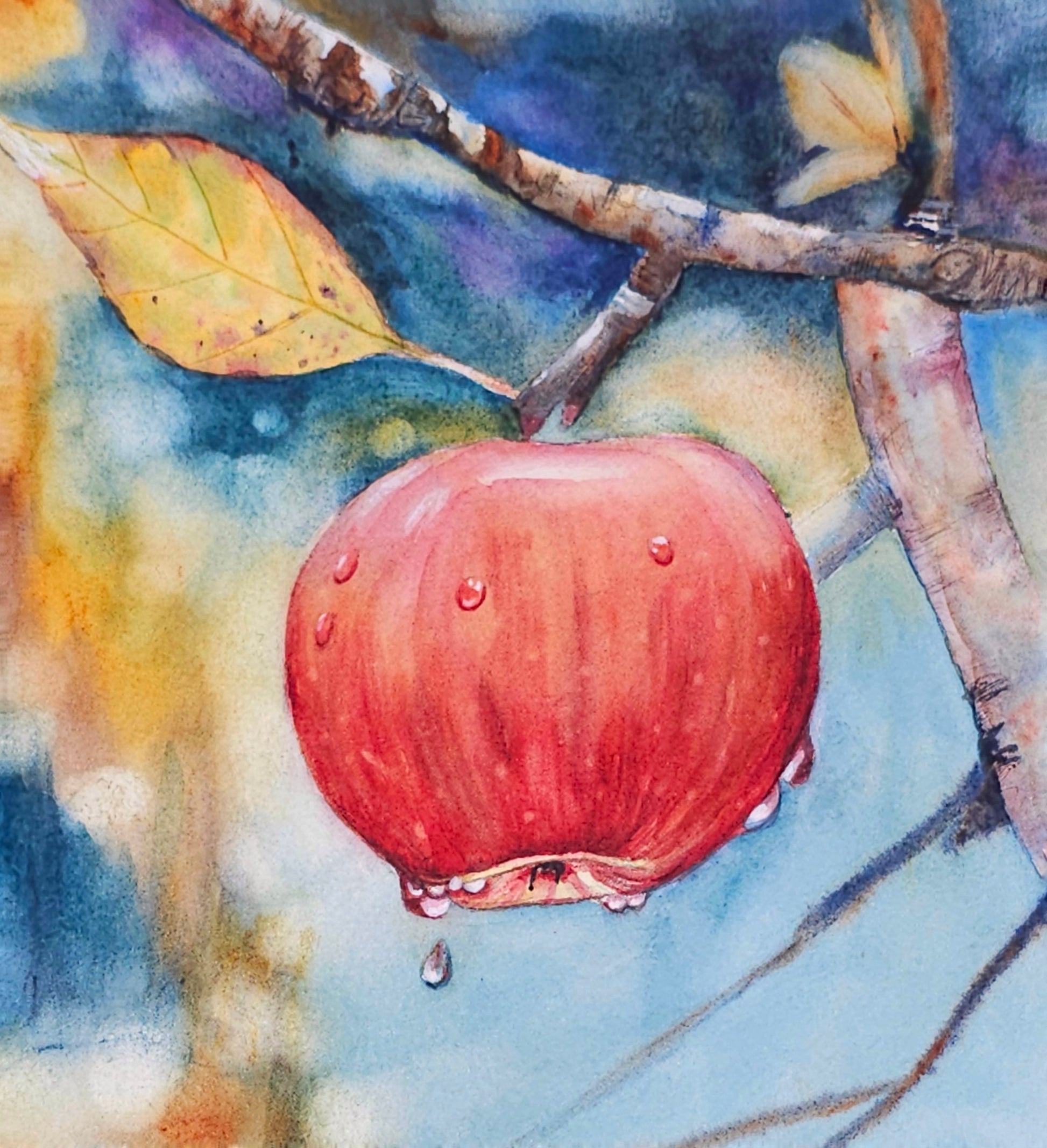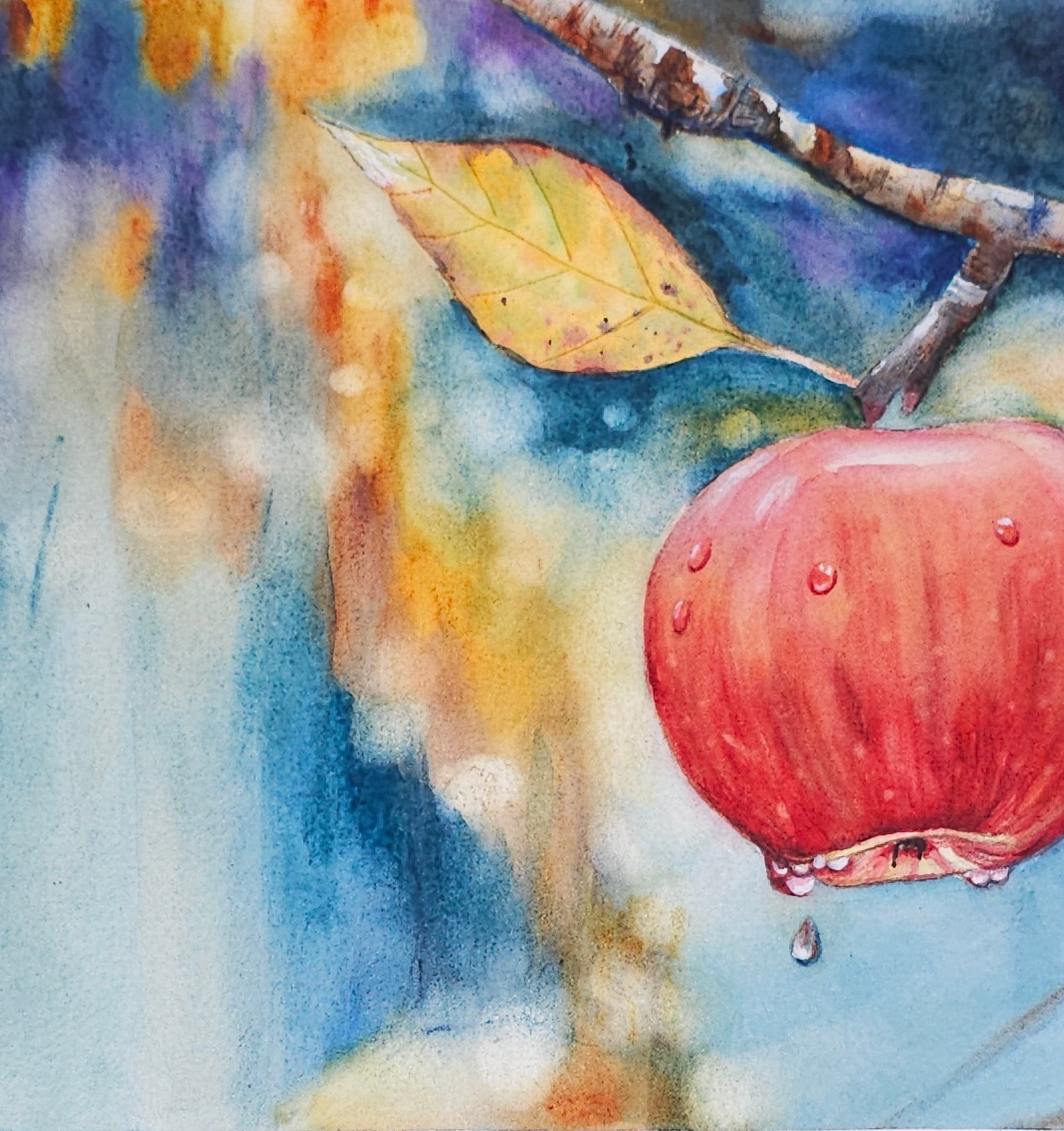 A single crimson apple, adorned with glistening dewdrops, hangs gracefully from a branch, embodying the richness of the autumn harvest. Autumn’s Jewel captures the fleeting beauty of the season, where warm hues and soft light create a sense of nostalgia and serenity. The delicate balance of realism and dreamy abstraction brings this piece to life, making it a timeless celebration of nature’s gifts.