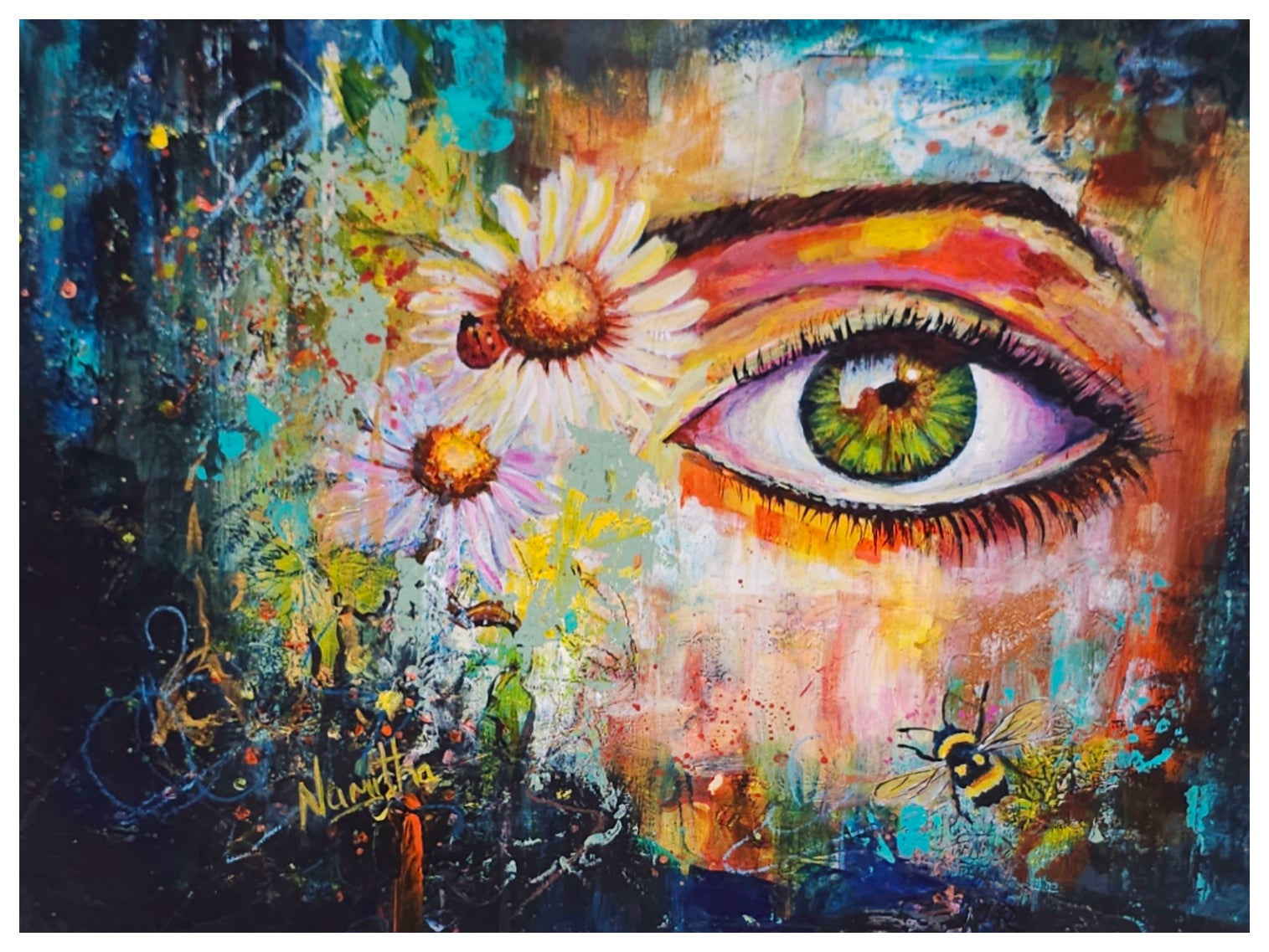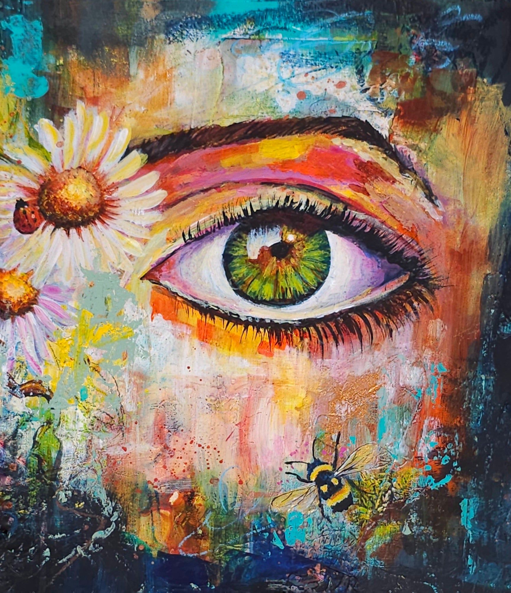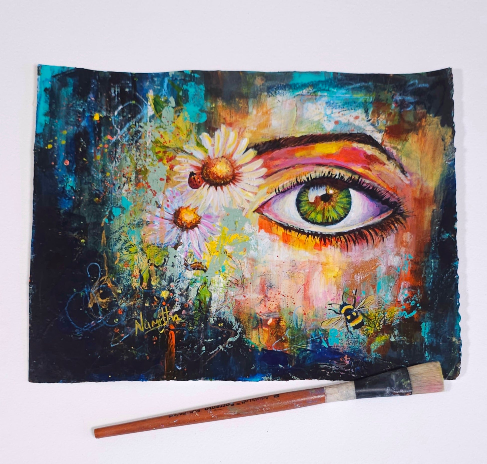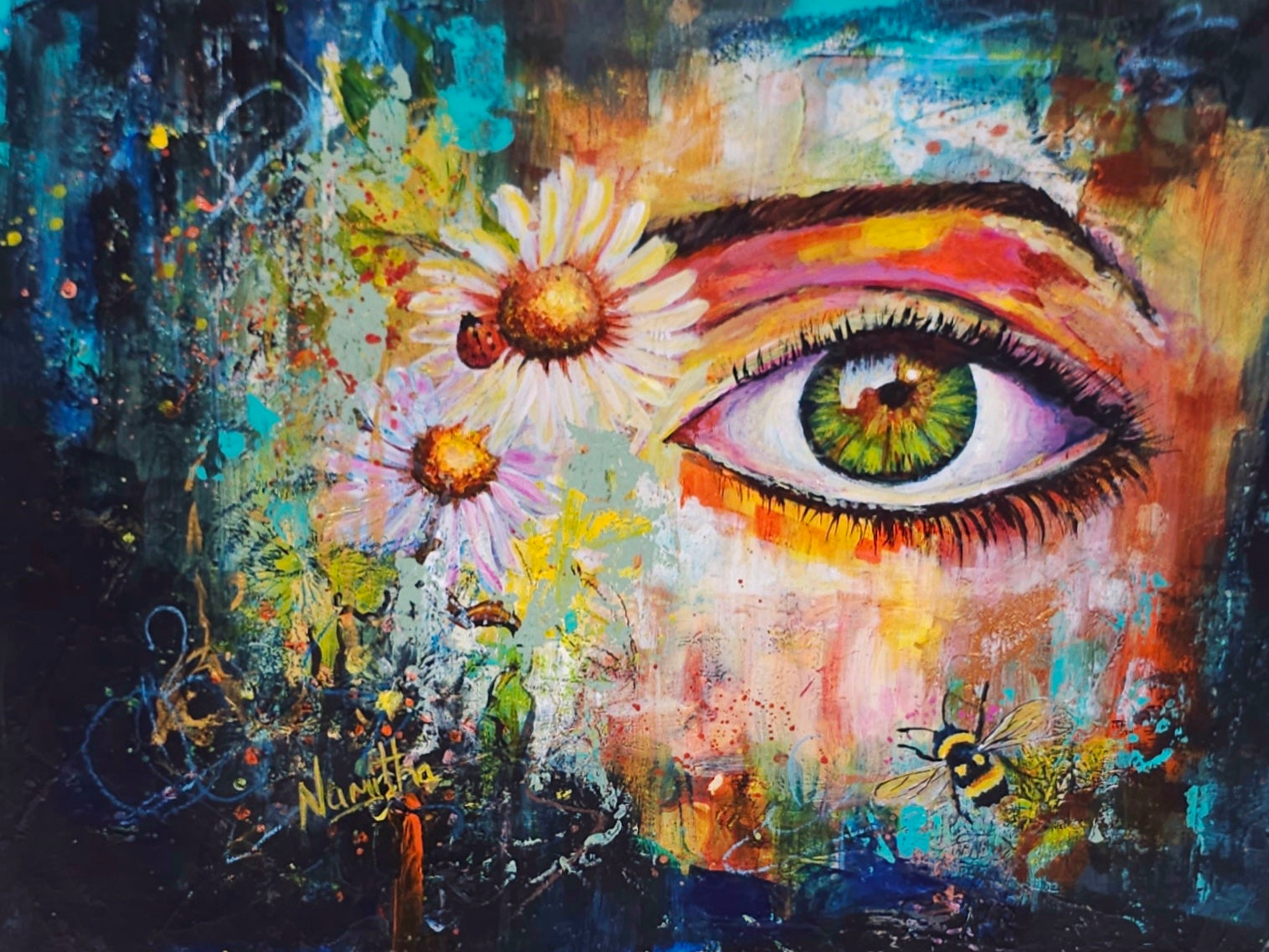 A mesmerizing fusion of nature and perception, Vision of Nature explores the deep connection between the human spirit and the world around us. The striking green eye, surrounded by blooming daisies, a buzzing bee, and abstract textures, symbolizes awareness, growth, and harmony with nature. Vibrant colors and expressive brushstrokes bring movement and emotion, making this piece a bold statement of creativity and imagination.