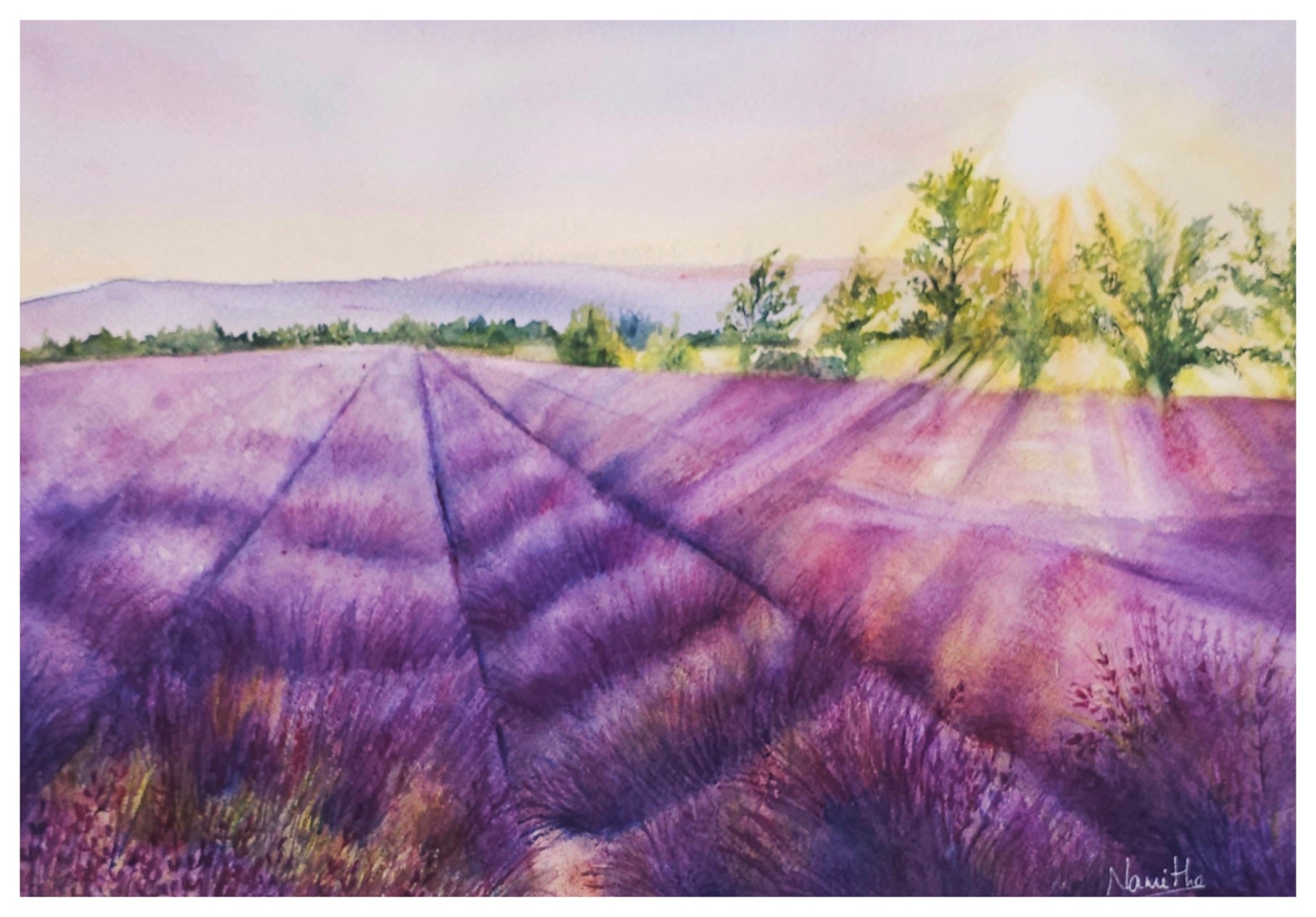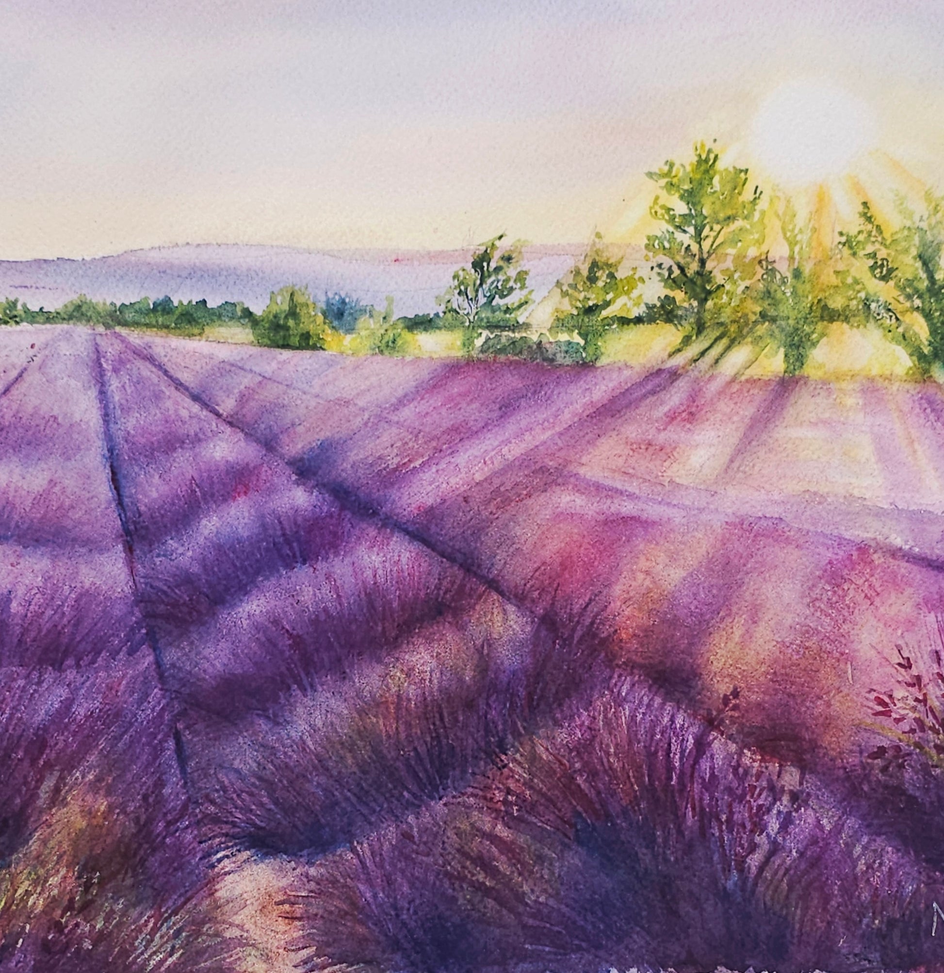 Golden sunlight filters through the trees, casting a warm glow over endless rows of lavender in full bloom. Lavender Serenity captures the peaceful beauty of nature, where soft purple hues meet the warmth of a gentle sunrise. The interplay of light and shadows creates depth, inviting the viewer to get lost in this tranquil landscape.