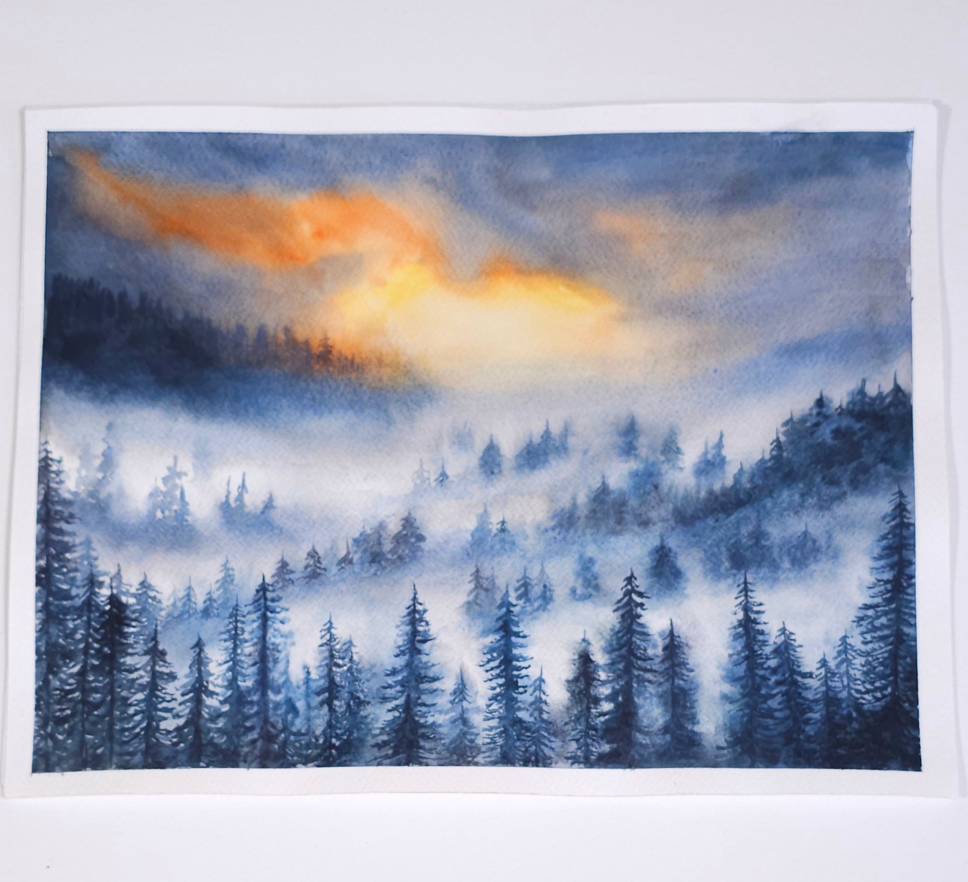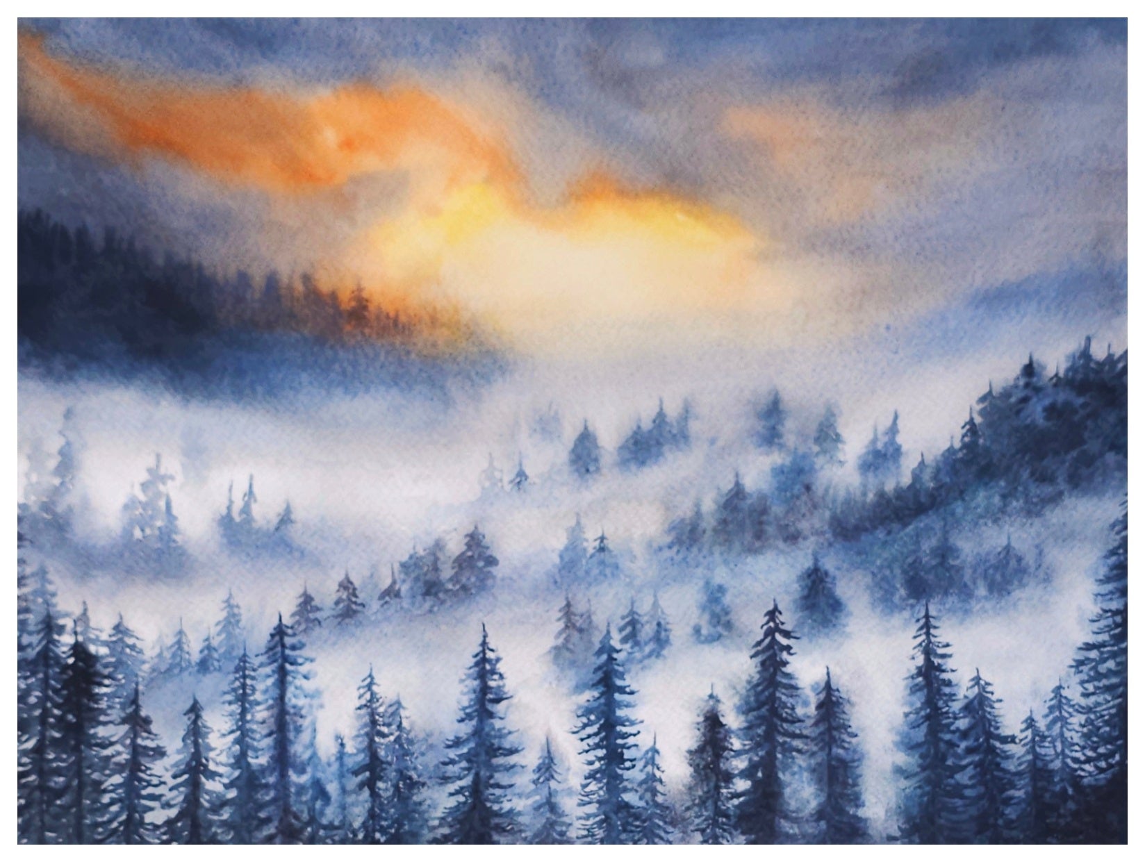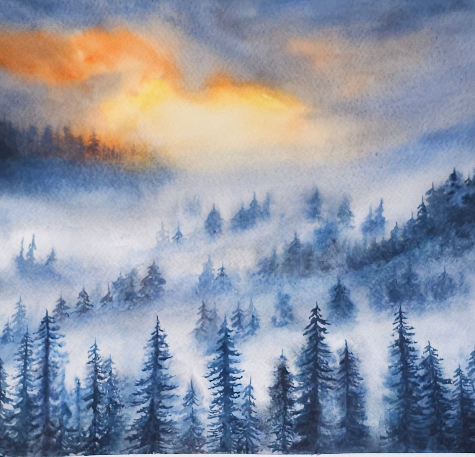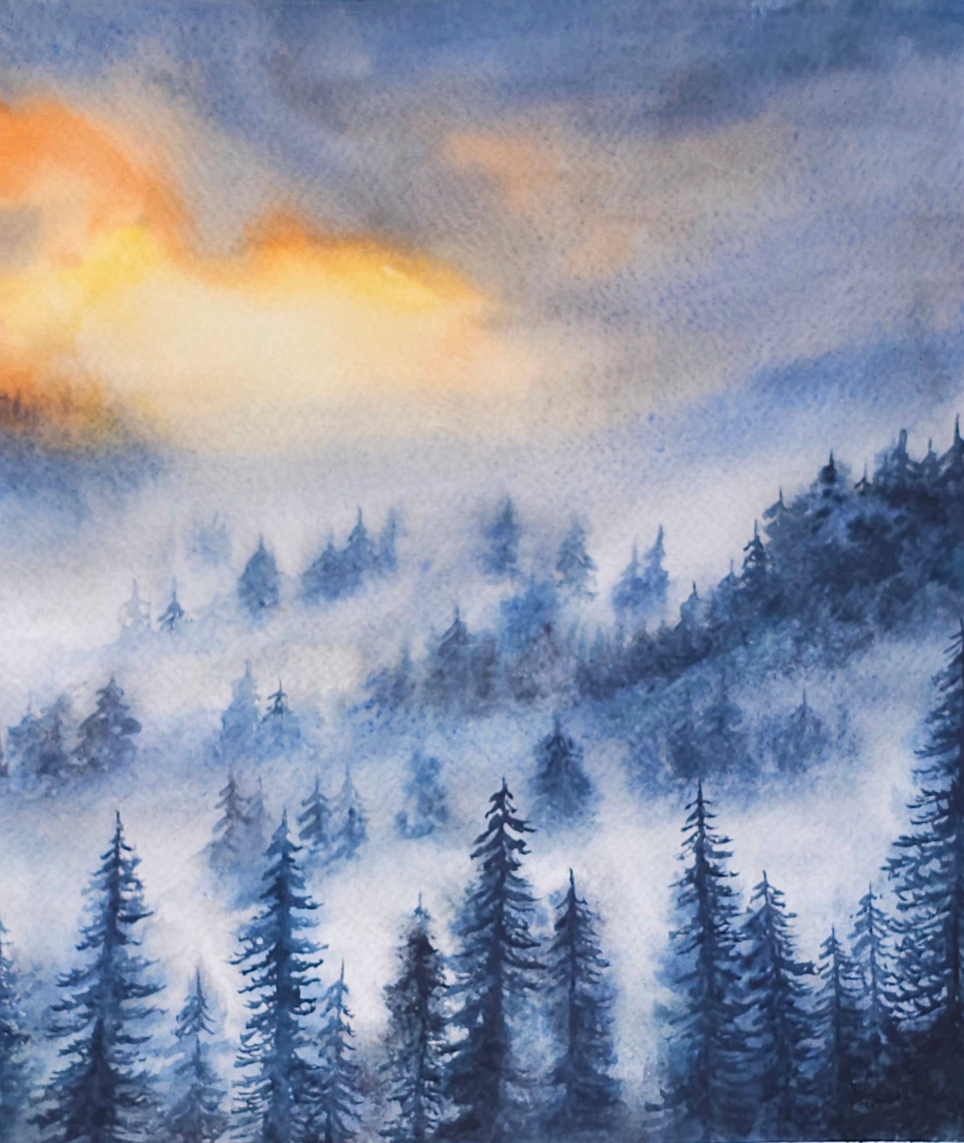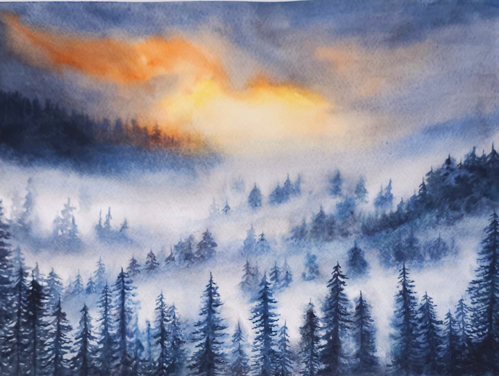 As dawn breaks, golden light pierces through the mist, gently unveiling a forest shrouded in mystery. Whispering Pines captures the quiet beauty of nature, where layers of fog weave through towering evergreens, creating a dreamlike, peaceful atmosphere. The contrast between the deep blues of the forest and the warmth of the rising sun evokes a sense of serenity and wonder.