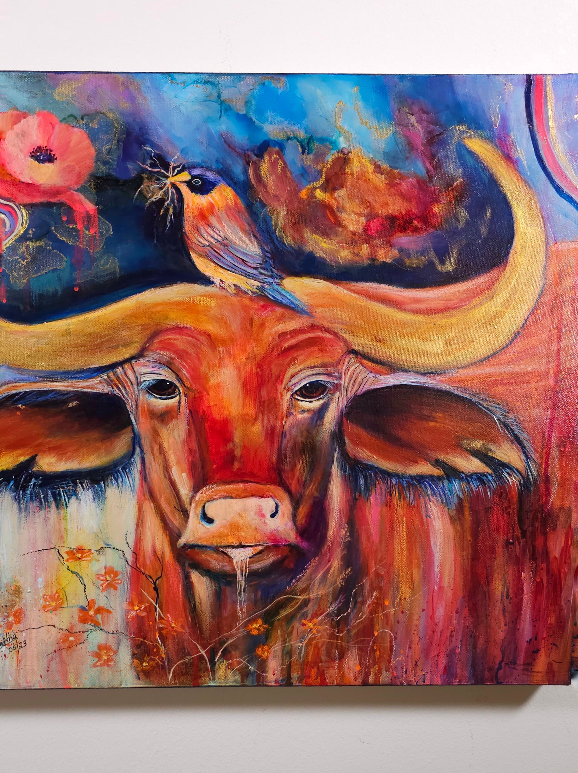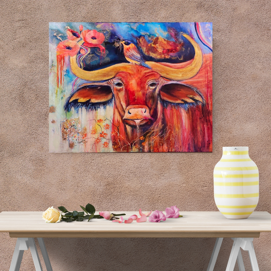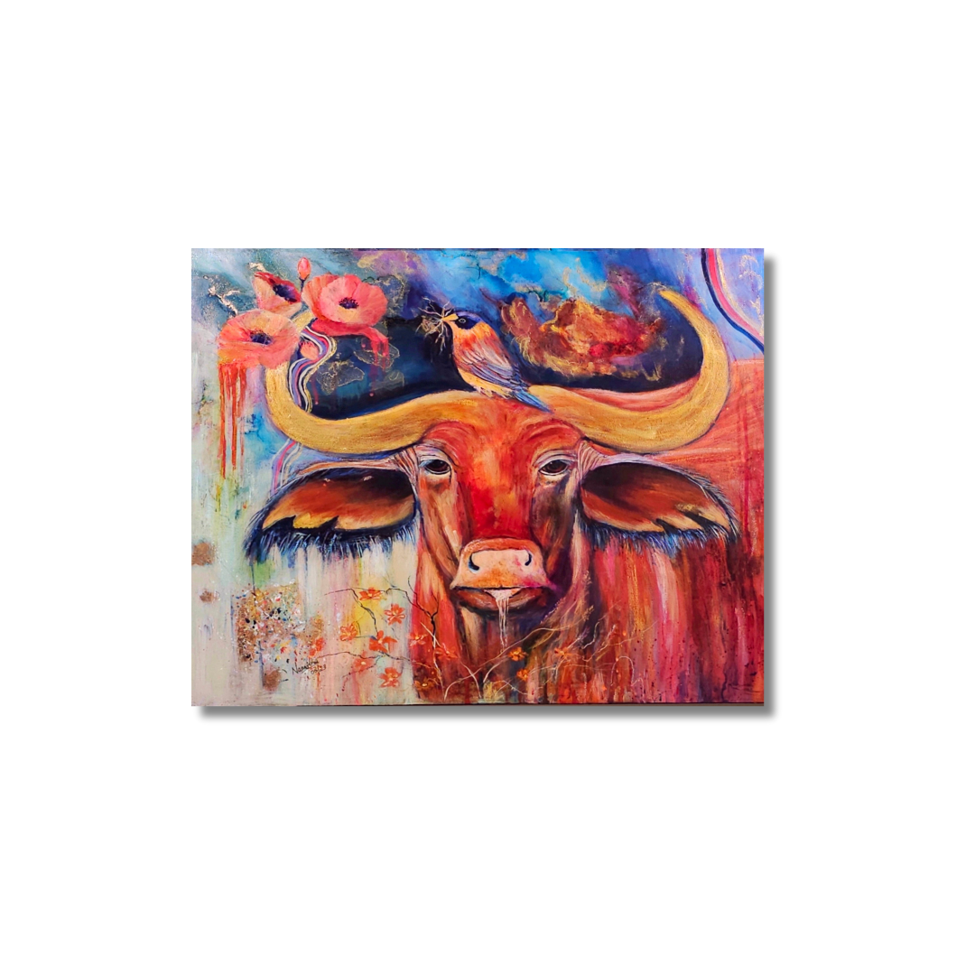 Strength & Serenity”is a captivating 20x24-inch mixed media painting that beautifully captures the essence of resilience and harmony in nature. The majestic OX, painted in striking warm hues of red, orange, and gold, symbolizes power, endurance, and grounded energy. Atop its mighty horns, a delicate bird perches, carefully weaving its nest—a poetic reminder of the balance between strength and gentleness, survival and creation.