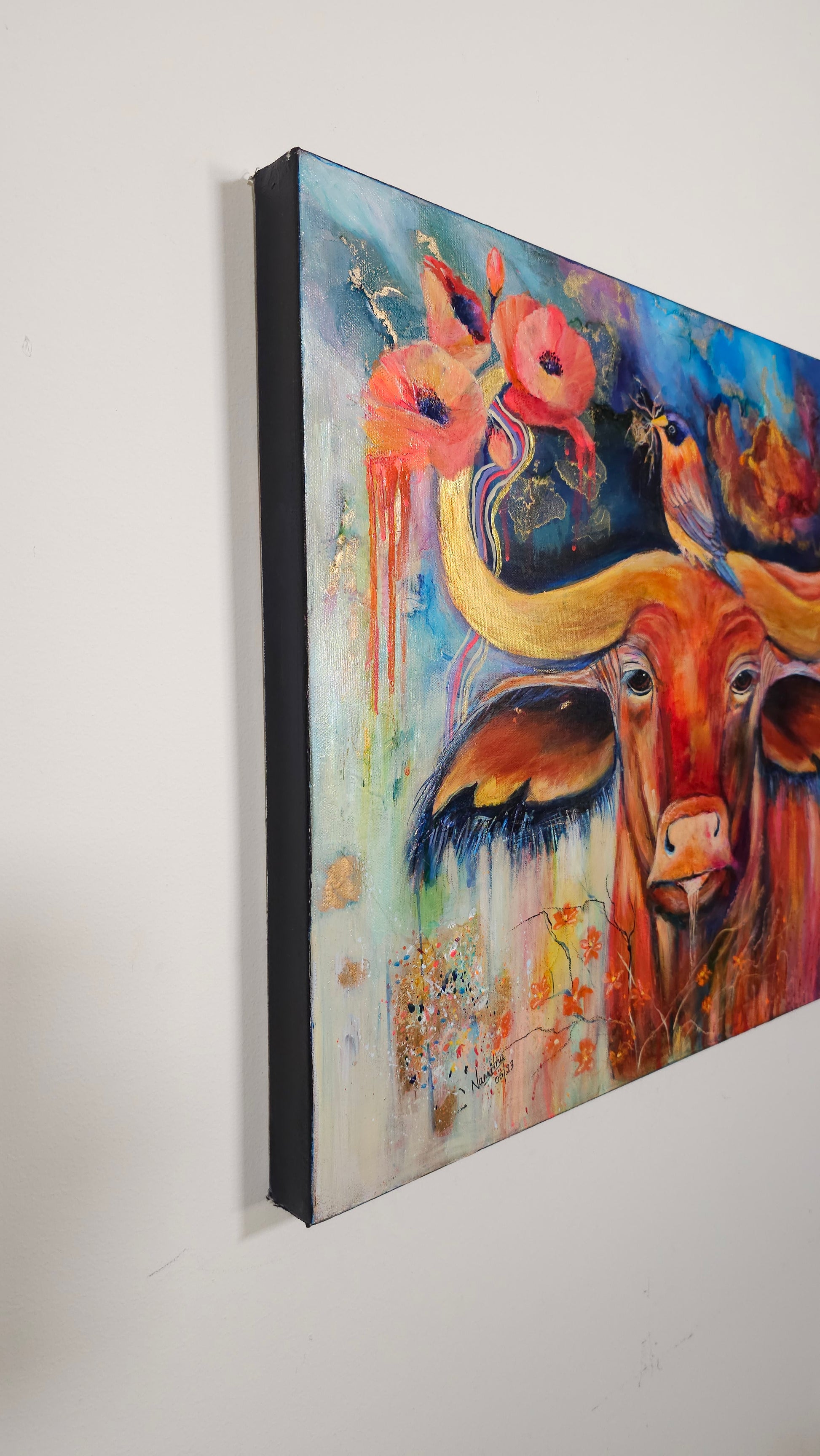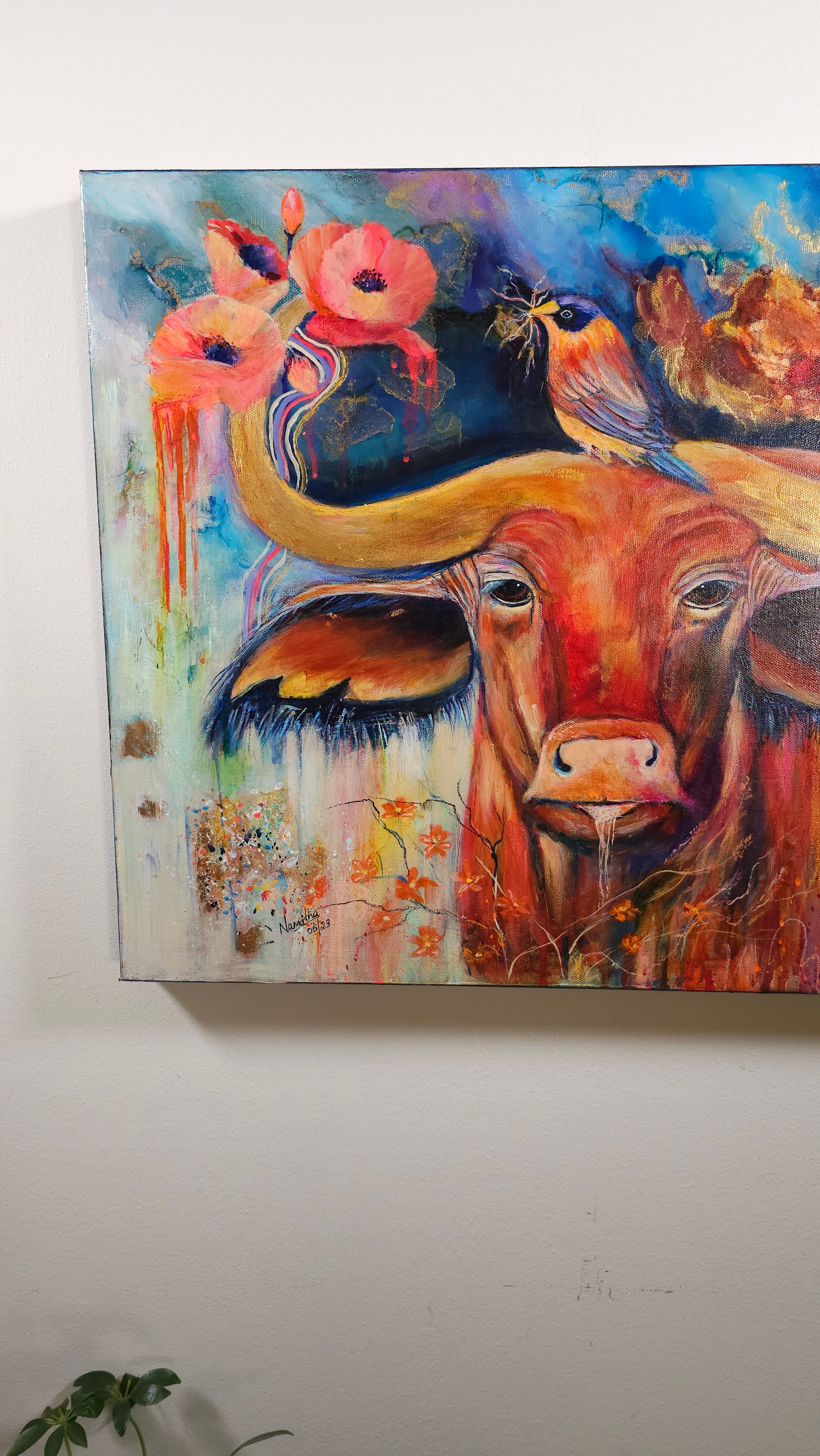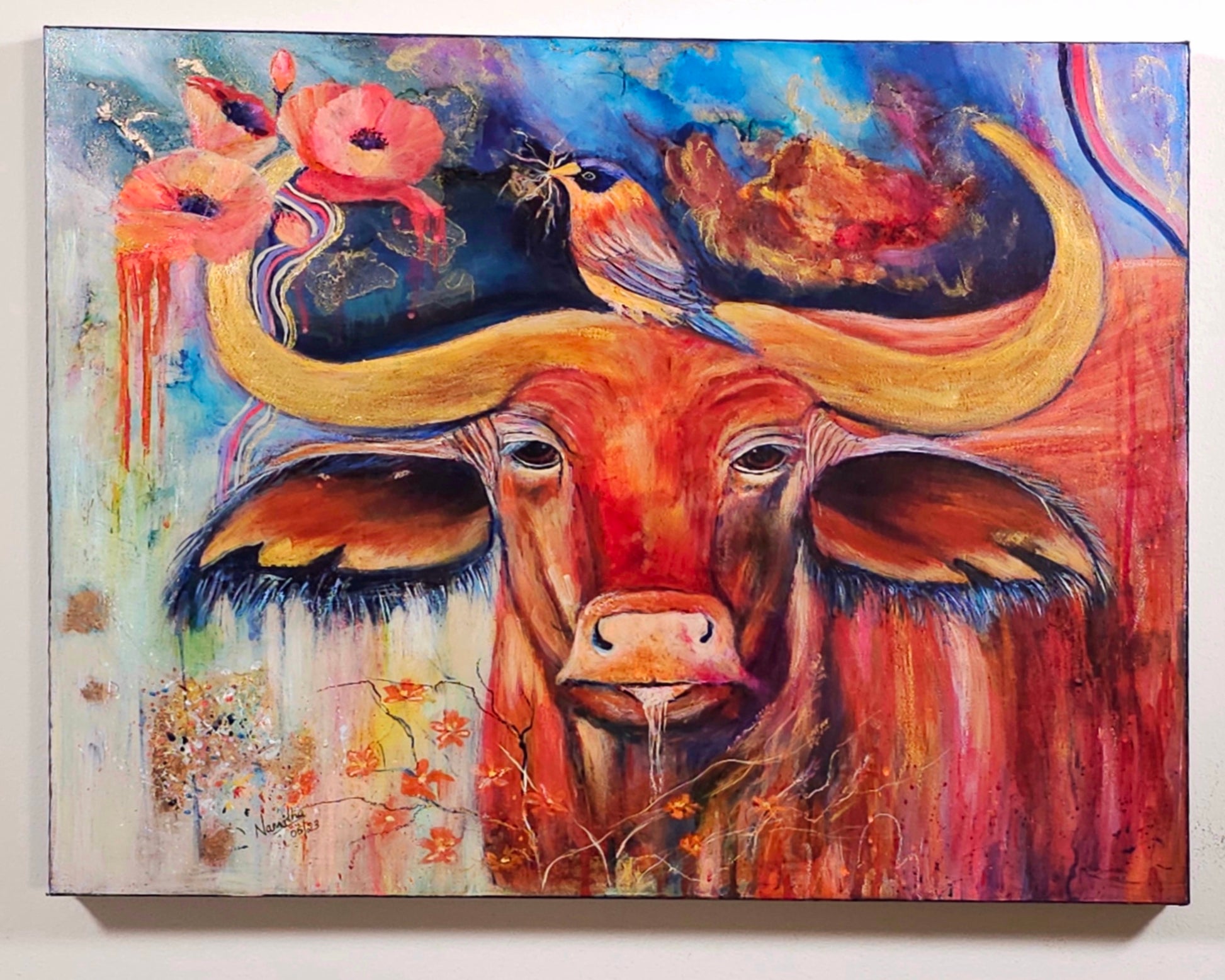 Strength & Serenity”is a captivating 20x24-inch mixed media painting that beautifully captures the essence of resilience and harmony in nature. The majestic OX, painted in striking warm hues of red, orange, and gold, symbolizes power, endurance, and grounded energy. Atop its mighty horns, a delicate bird perches, carefully weaving its nest—a poetic reminder of the balance between strength and gentleness, survival and creation.