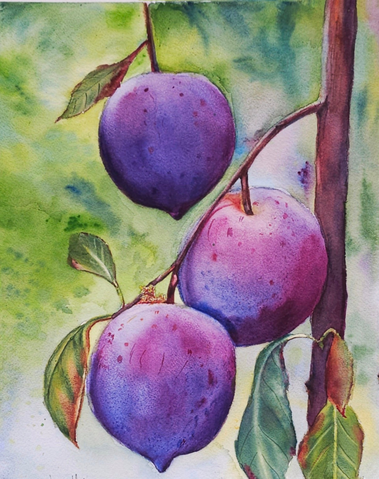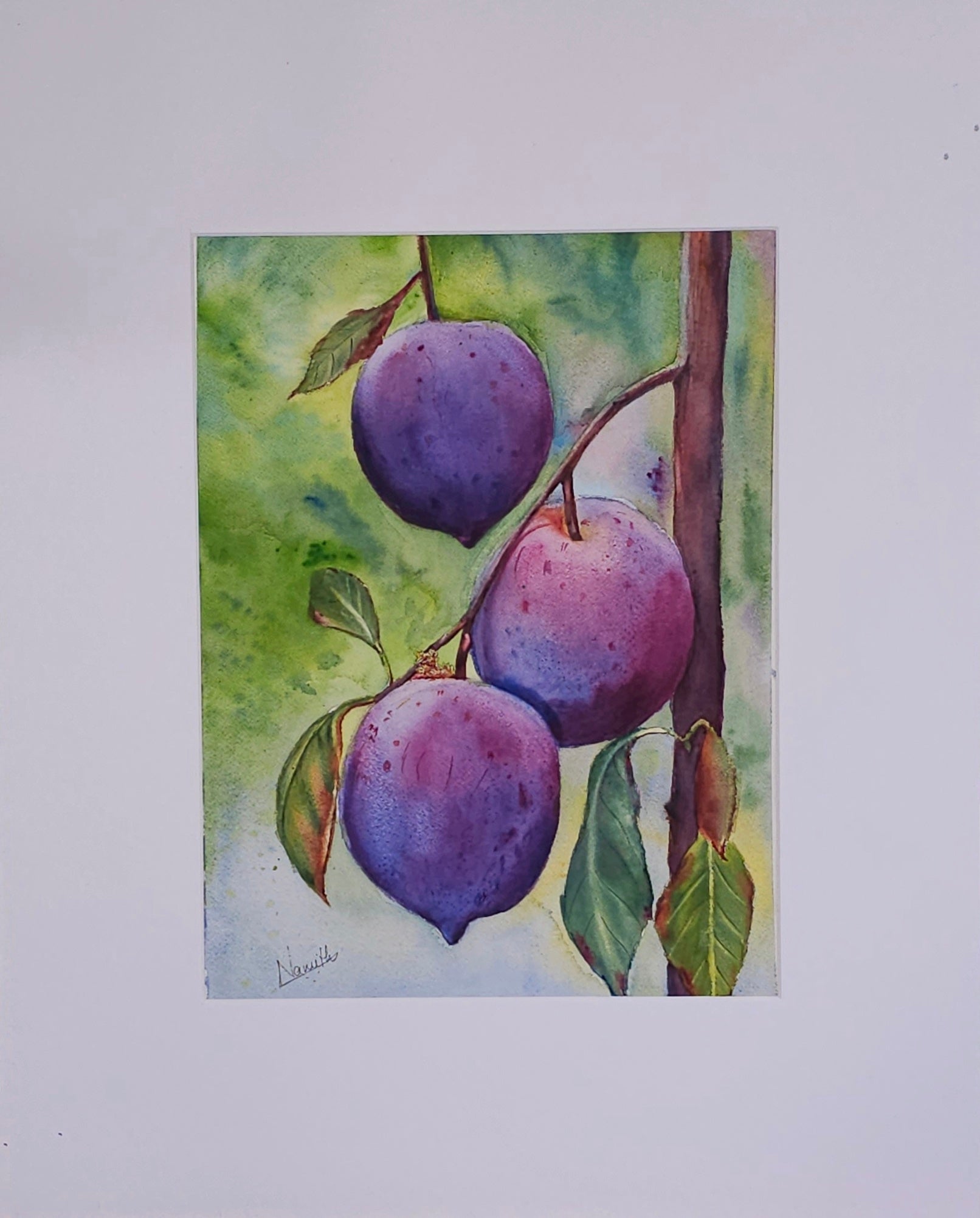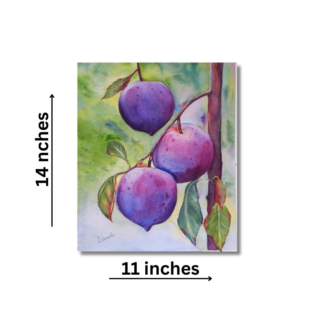 “Plum Harvest” is a delicate watercolor painting that celebrates the simple beauty of nature’s bounty. Featuring three ripe plums hanging gracefully from a branch, this piece brings a sense of calm and freshness to any space. The soft gradients, rich purples, and gentle greens blend effortlessly on cold press paper, showcasing the charm of hand-painted botanical art.
