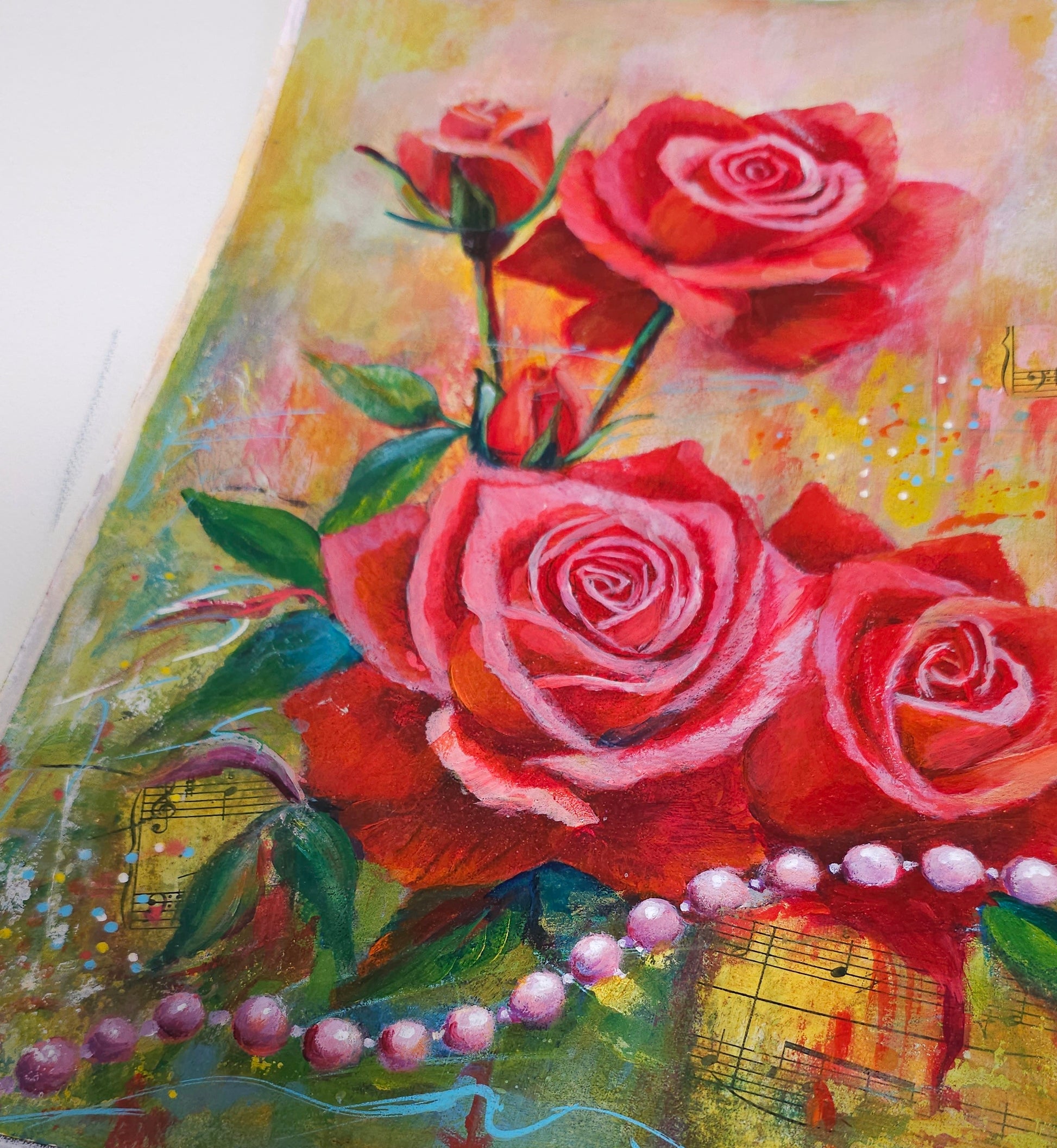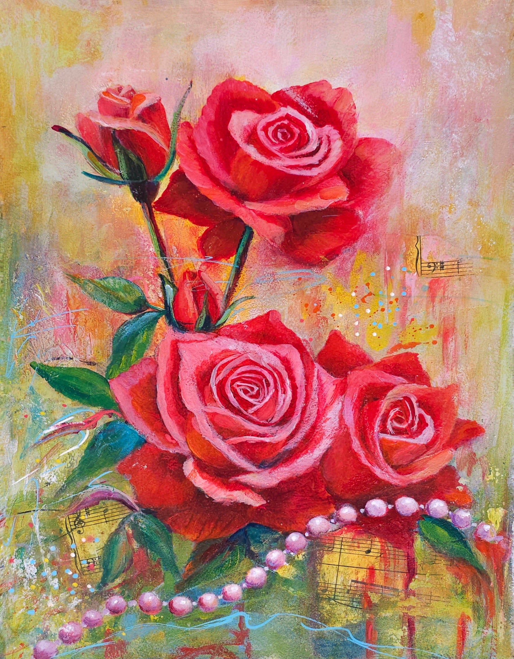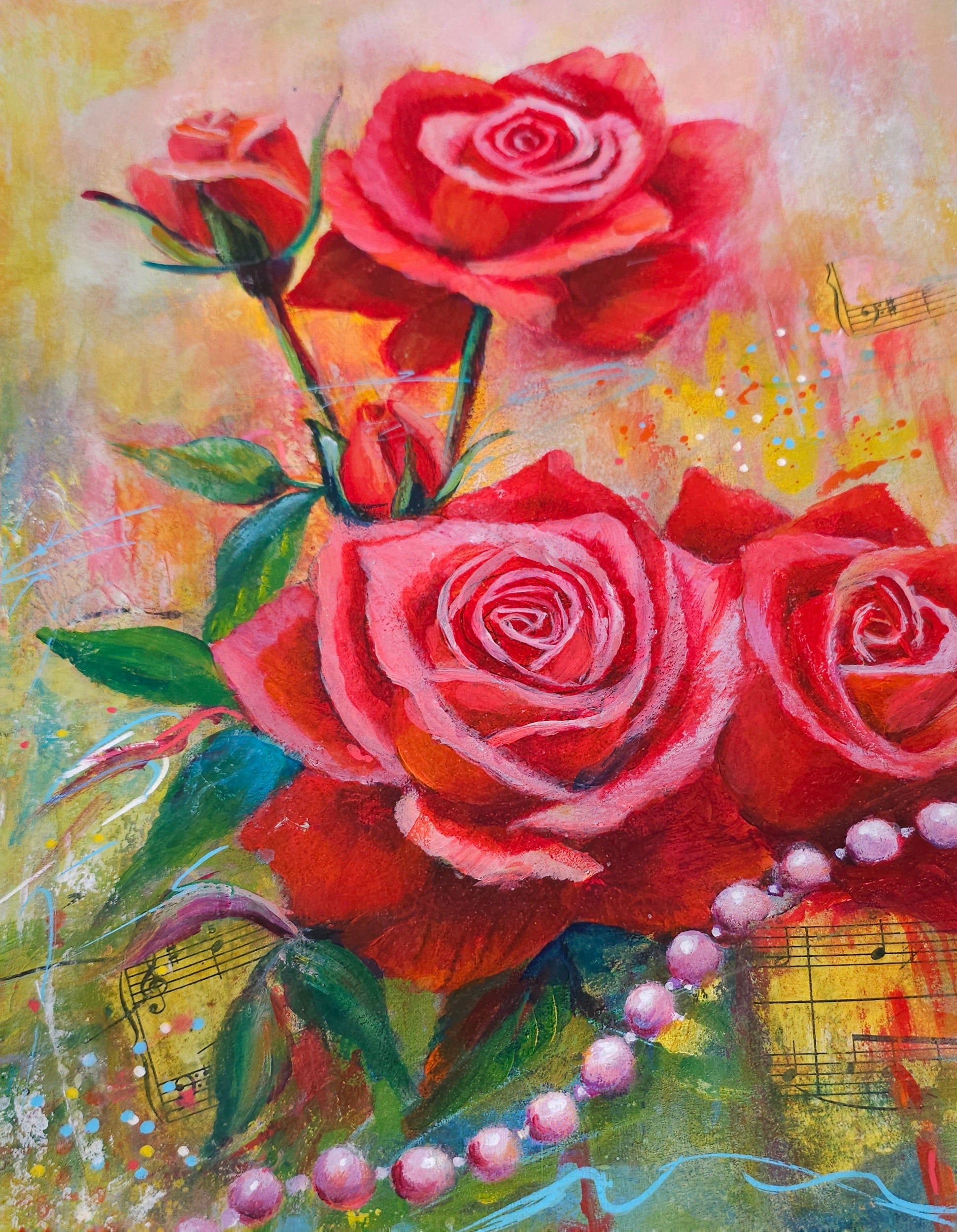 A symphony of passion and elegance, Melody of Roses captures the timeless beauty of blooming red roses intertwined with soft musical notes and delicate pearls. The textured background blends vibrant hues with expressive brushstrokes, creating a dreamlike fusion of romance and artistic rhythm. This piece evokes feelings of love, nostalgia, and the poetic essence of nature.