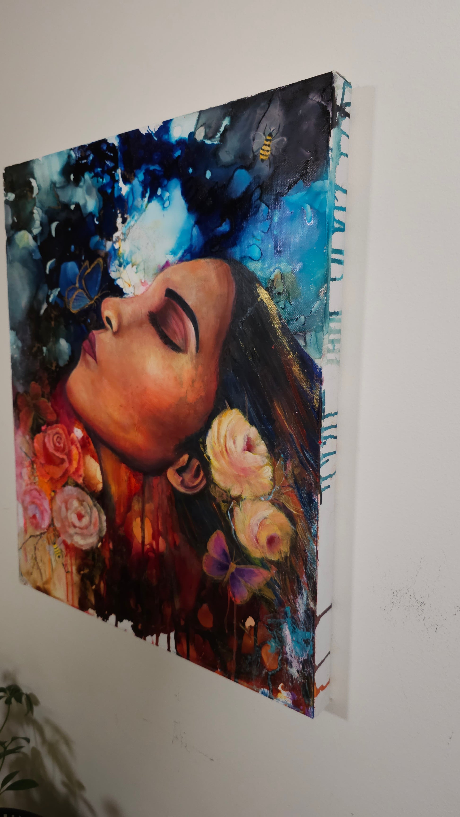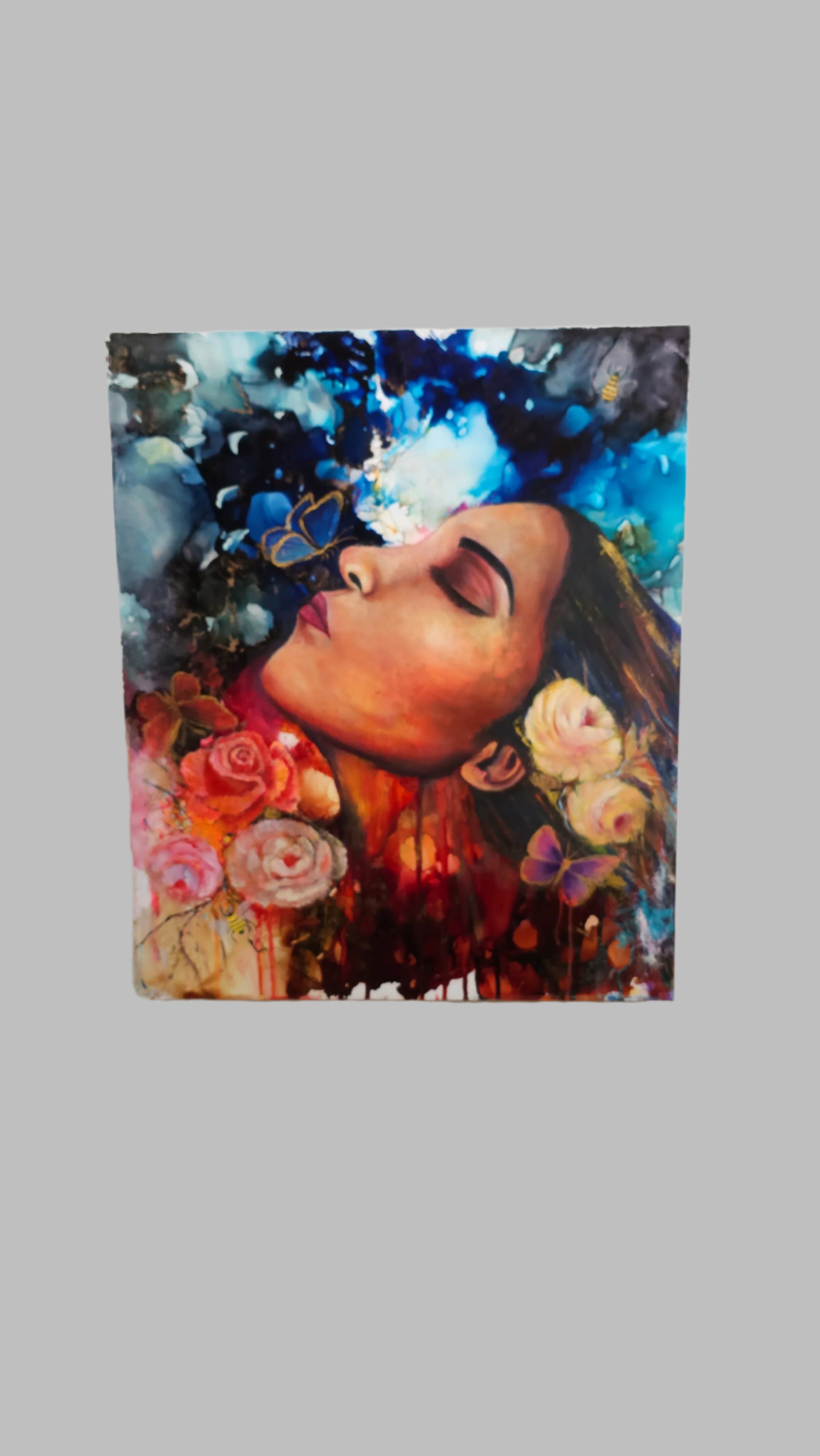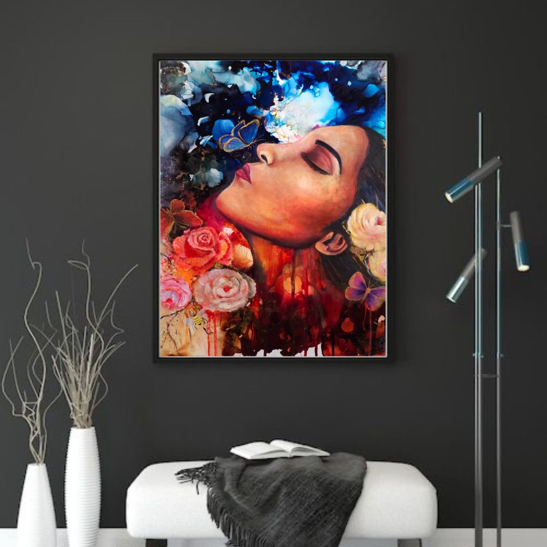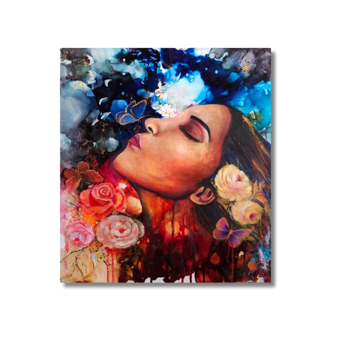 A mesmerizing fusion of realism and abstraction, Dreamscape Reverie portrays a serene woman immersed in a dreamlike state, surrounded by delicate roses, fluttering butterflies, and a cosmic blue expanse. The rich contrast of warm and cool tones evokes a sense of transformation, tranquility, and connection with nature. Intricate textures and gold accents add depth and luminosity, making this piece a striking focal point for any space.