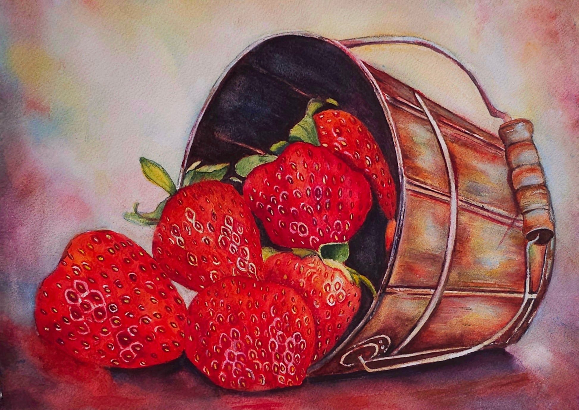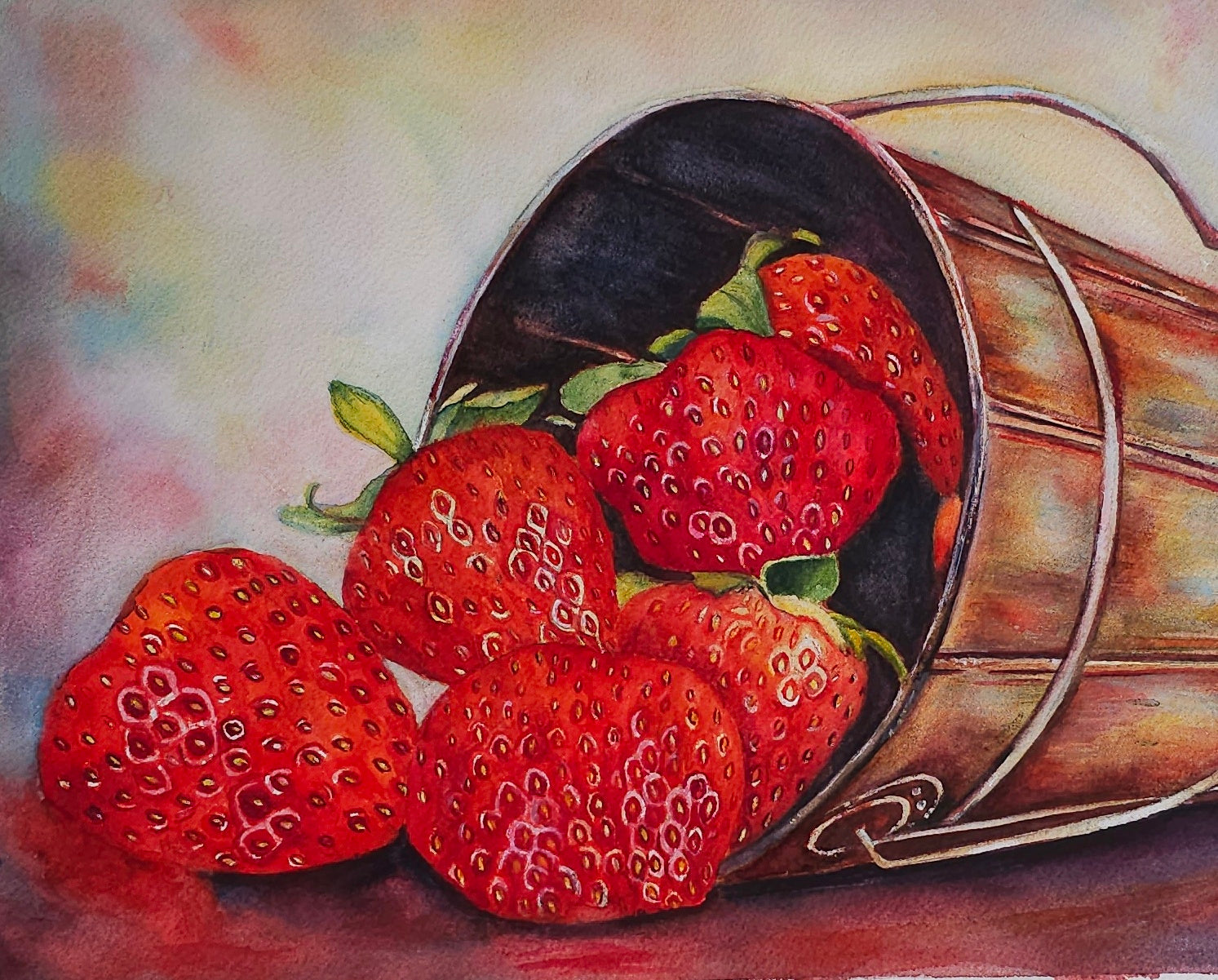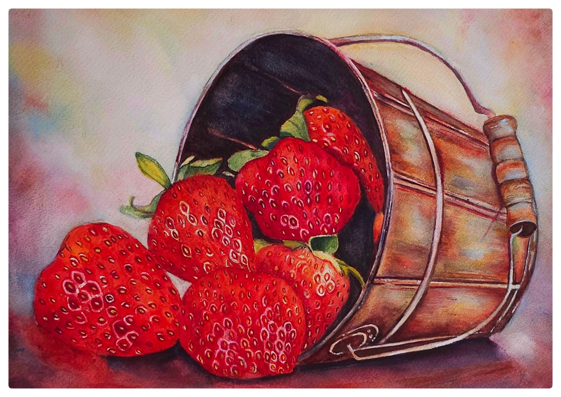 Bring the beauty of fresh-picked strawberries into your space with this stunning original watercolor painting. Featuring a rustic metal bucket spilling vibrant red strawberries, this artwork captures the charm of nature’s bounty with rich colors and delicate details.