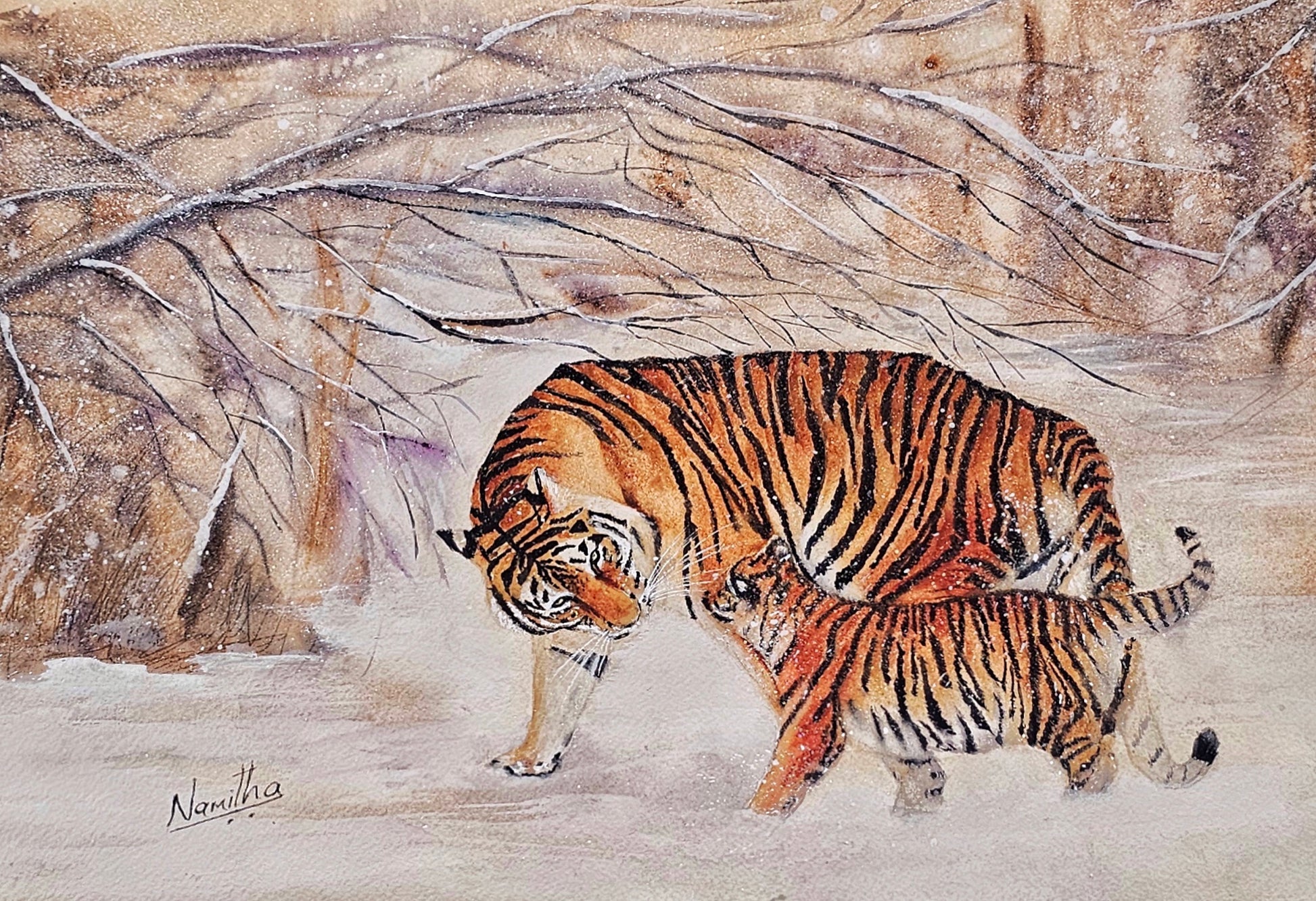 A mother’s love is fierce, protective, and boundless. This watercolor painting captures the tender bond between a tigress and her cub, navigating the beauty of a snowy wilderness. Every brushstroke reflects strength, warmth, and the unbreakable connection of family.